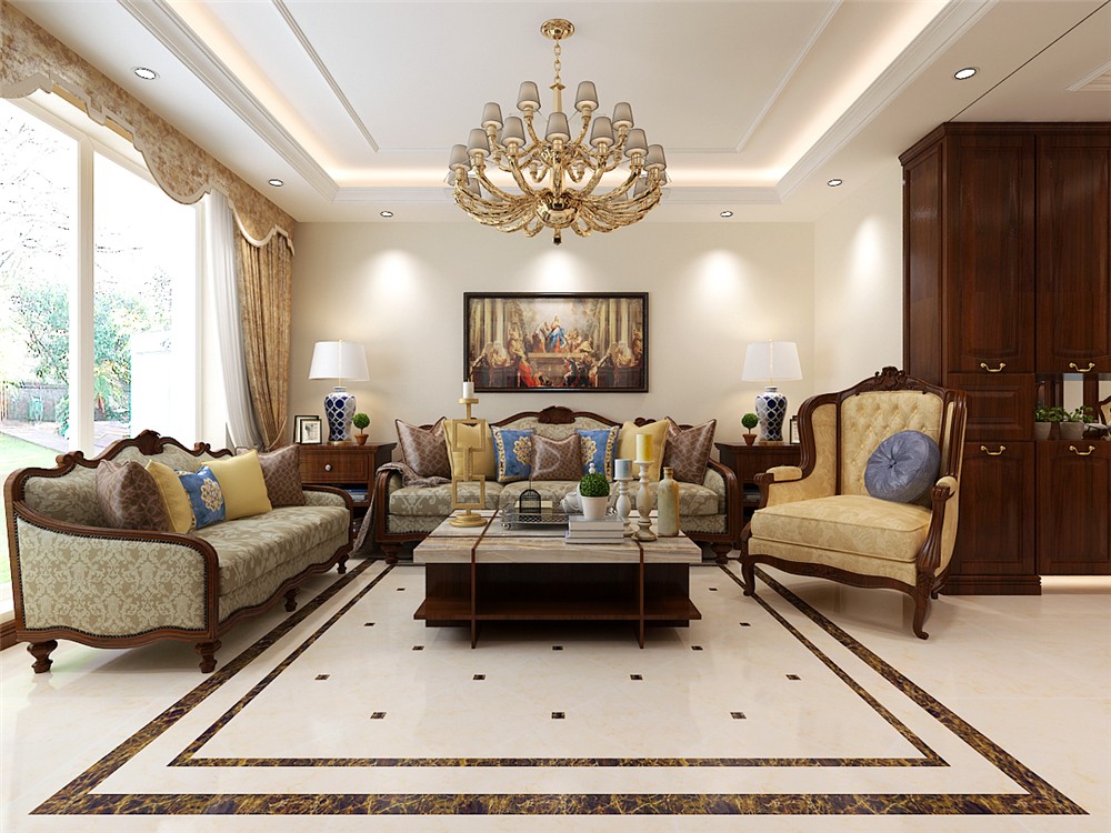 客廳作為待客區域,一般要求簡潔明快,同時裝修較其它空間要更明快通常使用大量的石材和木飾面裝飾;美國人喜歡有歷史感的東西,這不僅反映在軟裝擺件上對仿古藝術品的喜愛,同時也反映在裝修上對各種仿古墻地磚、石材的偏愛和對各種仿舊工藝的追求上。