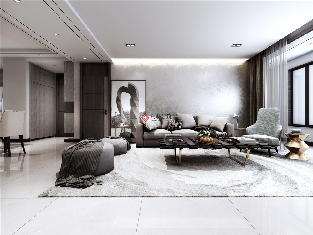 港式輕奢,以金屬色線條感營造居家空間金碧輝煌的豪華感,簡潔不失時尚,是快節奏都市生活的休憩的港灣。金昌花園陳女士的家整體彷如一幅畫,弧形的灰色地毯總是會給人無限想象,好像是一場來自光年之外的低聲呢喃,隱隱能聞到一種輕奢的味道,那是主人身份的象征,更是對于家的情感需求