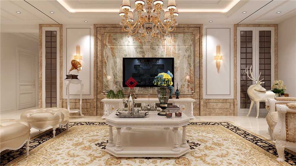 五里河整體色調寧靜而和諧,遠感色的白,近感色的原木色,給人回歸自然的平靜感。平衡空間之美,每一個圖案、每一個細節中都可體味到,湖藍色靠墊成為主角,但又不會在空間中過于搶眼破壞整體的安逸氣氛。同時大理石背景墻又不失高貴的氣質